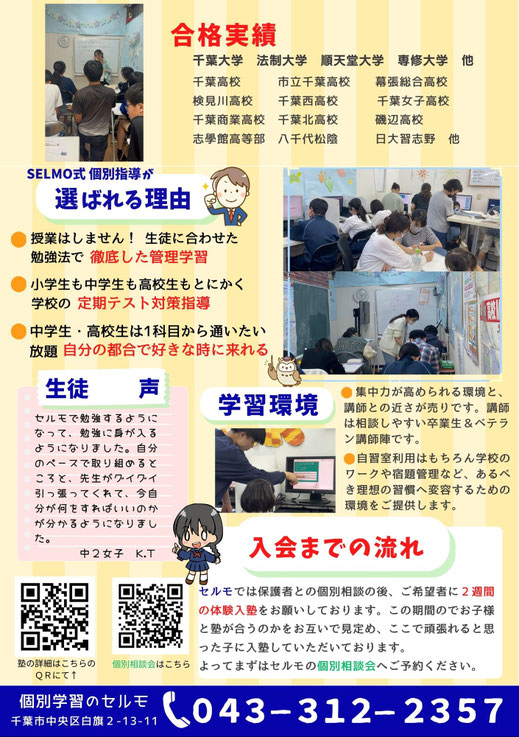 時代の移り変わりとともに成長し、この地に在り続けた私たち運営陣が他にはないサービスの実力であると自負しております。(令和5年度千葉高、市立千葉高も合格者輩出)
